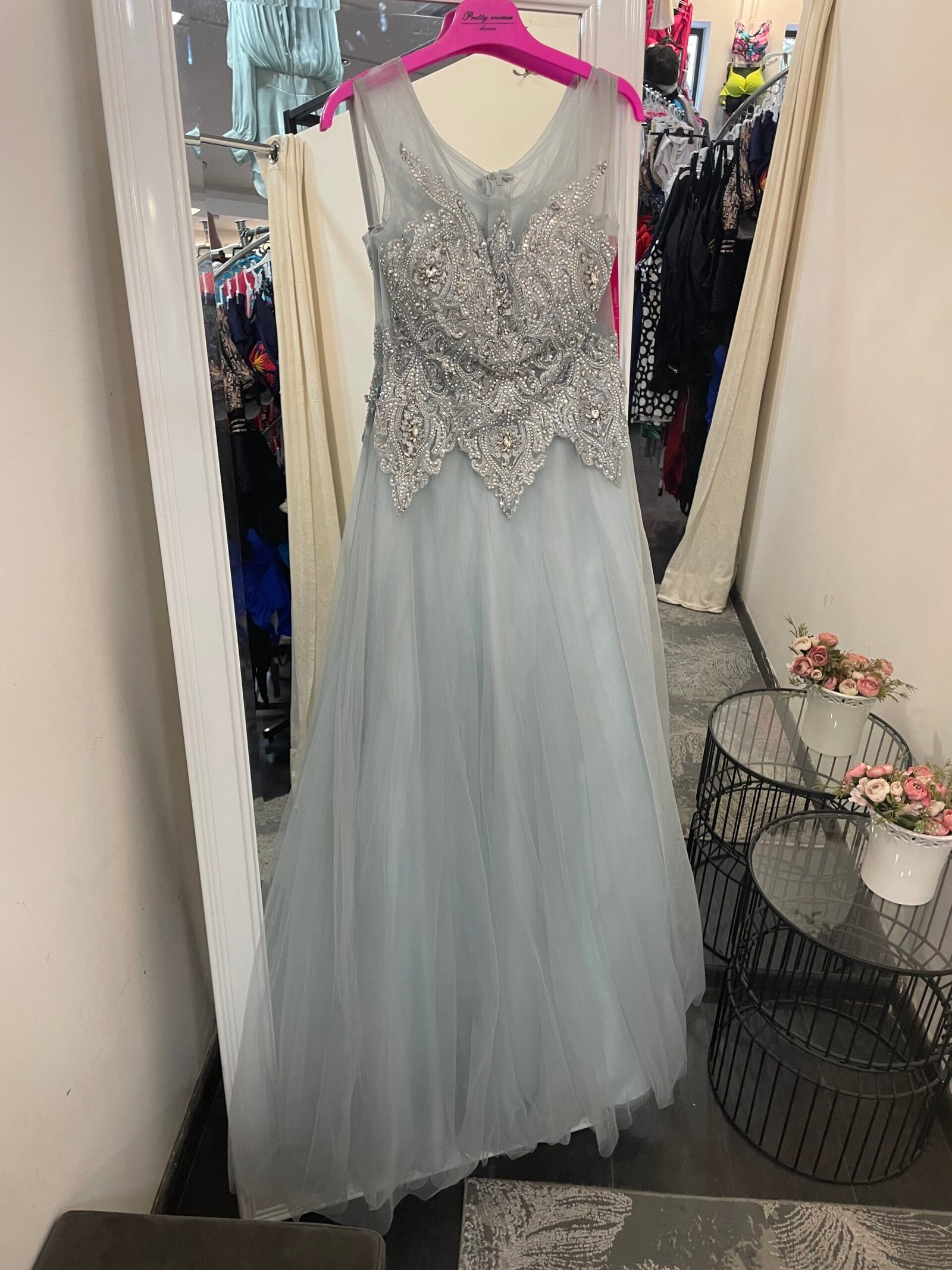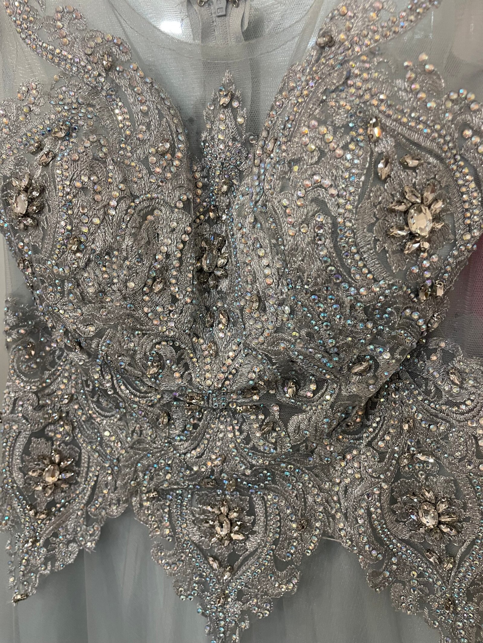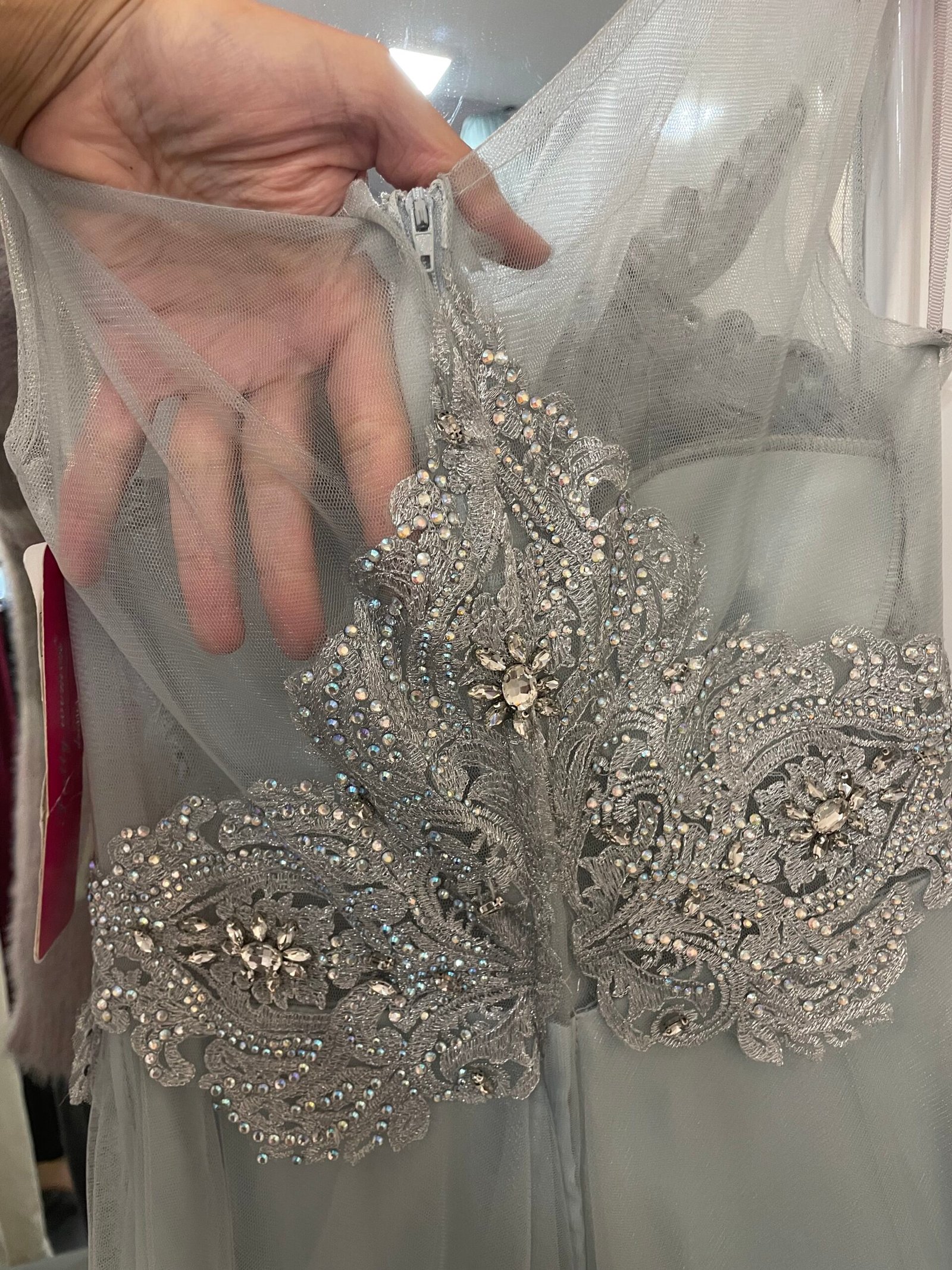 Ši ilga sidabro spalvos suknelė dvelkia rafinuotumu – viršus puoštas įmantriais nėriniais ir žėrinčiais kristalais, kurie subtiliai gaudo šviesą. Tiulinis sijonas lengvai krenta ir suteikia pasakišką lengvumo įspūdį, o nugara užsegama paslėptu užtrauktuku.